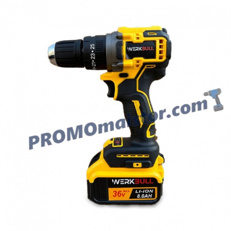 1. Акумулаторен безчетков винтоверт WERKBULL е подходящ за редица ремонтни дейности. Снабден е с три режима на работа завиване на винтове, пробиване и ударно пробиване и 16 степенно регулиране на момента в режим винтоверт. Патронникът е метален и се самозатяга за по-лесна смяна на принадлежностите. Ръкохватката е ергономична и гумирана за добър захват.