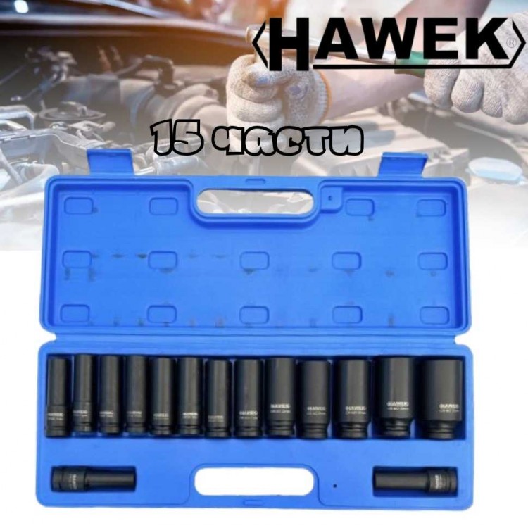 Ударни Вложки Hawek 1/2" 15-части е висококачествен комплект, достатъчно устойчив при работа. Инструментите са изработени от висококачествени материали, гарантиращи качество и дълъг живот на експлоатация. Комплектът е подреден в пластмасова кутия, която е удобна за съхранение и транспорт.