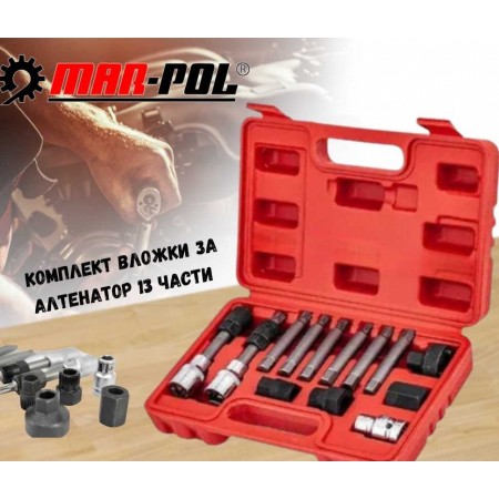 Комплект вложки за алтернатор 13 части MarPol е предназначен за сваляне на генератори, което го прави идеално допълнение към оборудването на всеки автосервиз. Инструментите са изработени от висококачествена стомана, което гарантира дълъг живот на експлоатация. Комплектът се предлага в пластмасово ку..