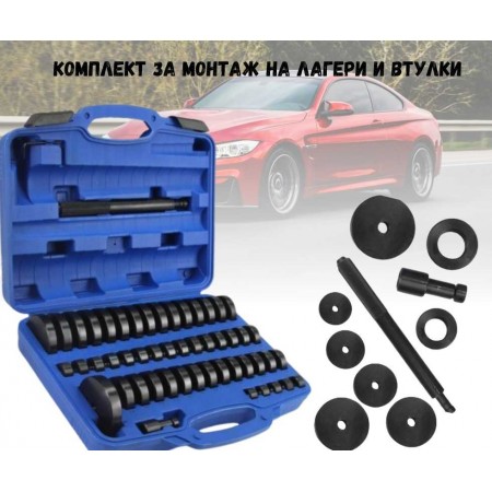 Комплектът за монтаж на лагери и втулки е подсилен и практично събран в куфар. Състои се от 52 части. Този комплект Ви позволява сами да си направите инструмента, който Ви е нужен, според конкретния случай и автомобил. Такъв инструмент е нужен на всеки автосервиз или домашен майстор. Има всички разм..