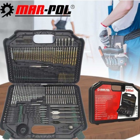 Комплект битове и свредла MARPOL  246 части са професионални инструменти, предназначени за различни ремонтни дейности. Комплектът се състои от 246 части ( пълен набор от накрайници за винтоверт и свредла за пробиване в дърво, метал и зидария). Доставя се в  пластмасов куфар, удобен за прен..